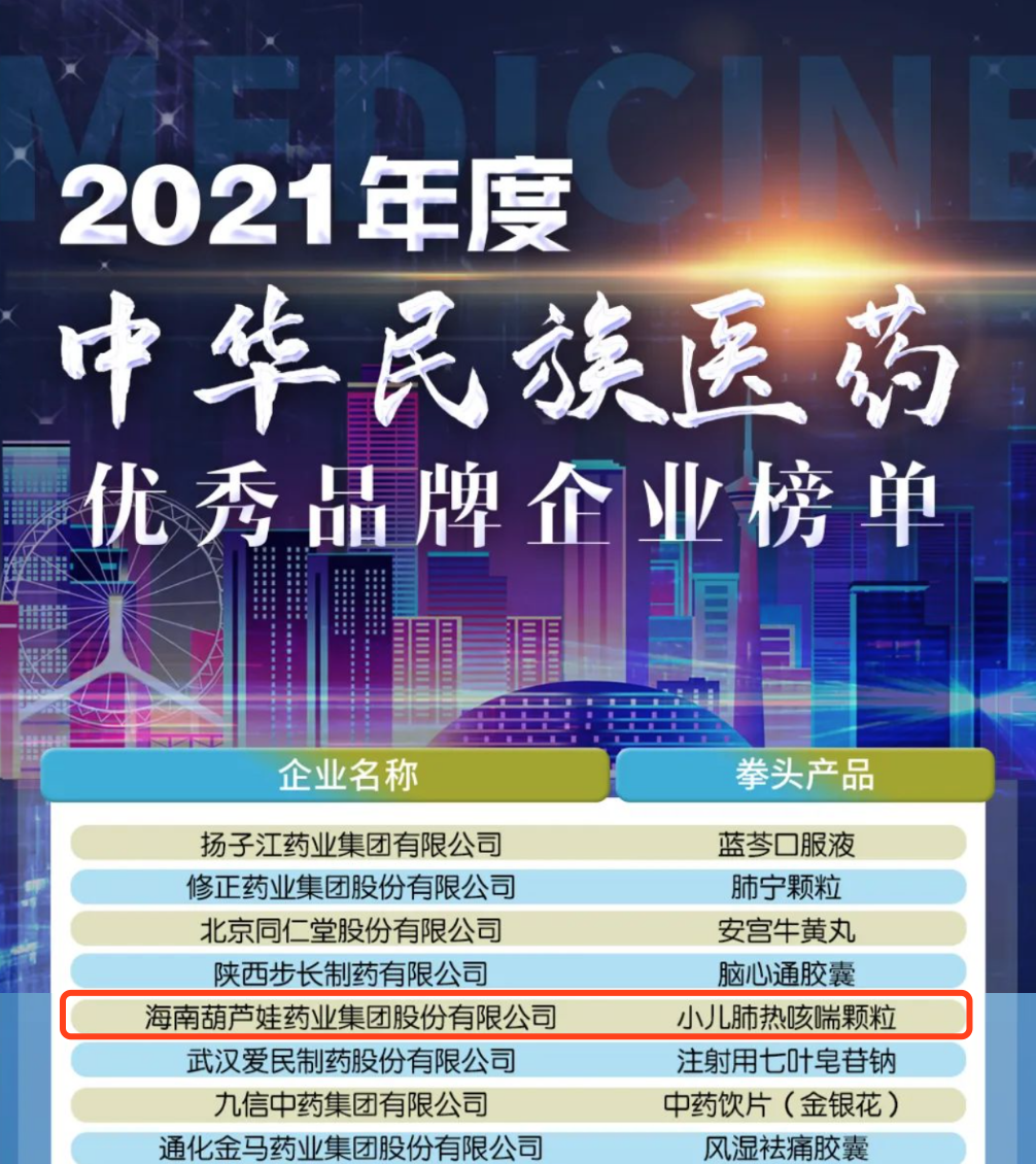 12月29日,全国工商联医药业商会发布了“2021年度中华民族医药优秀品牌企业榜单”,z6尊龙药业集团凭借黄金单品小儿肺热咳喘颗粒(4克)实力登榜。